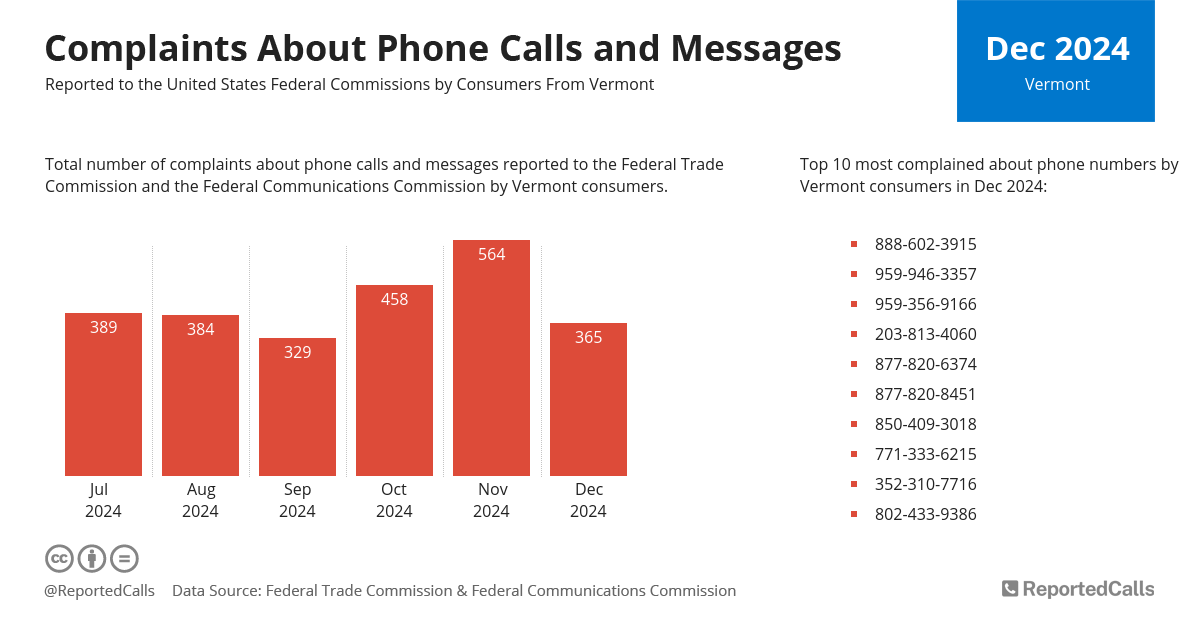 In December 2024, consumers from Vermont filed 347 complaints about phone calls and text messages, down 38% from the previous month.